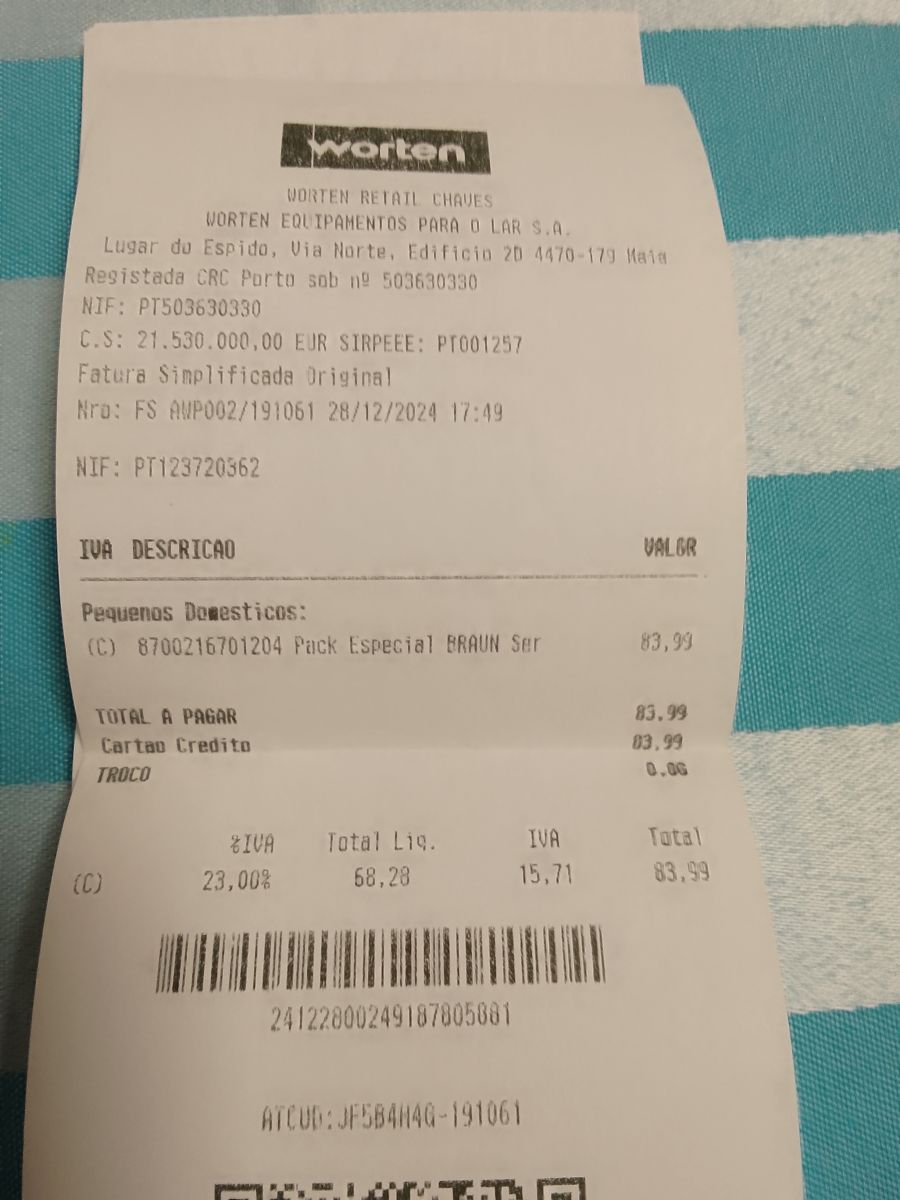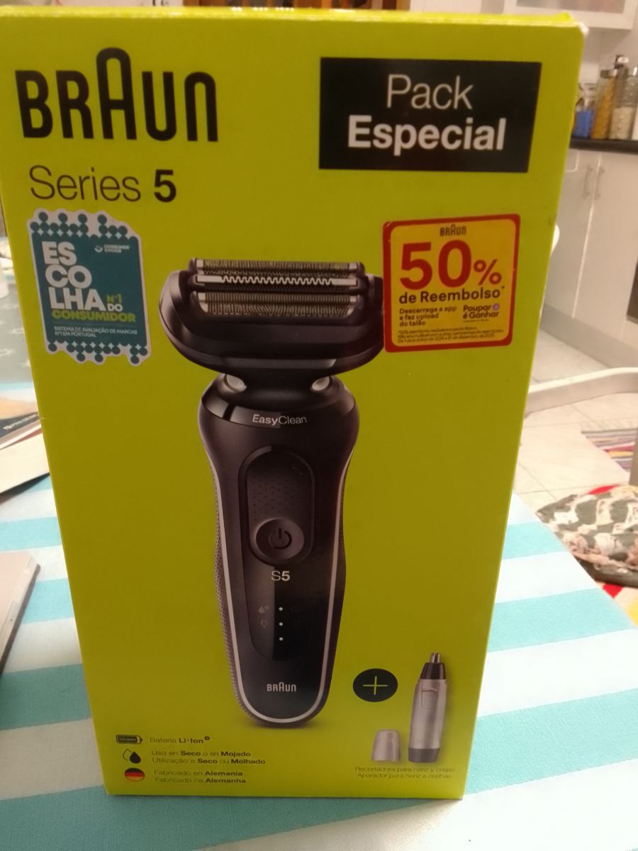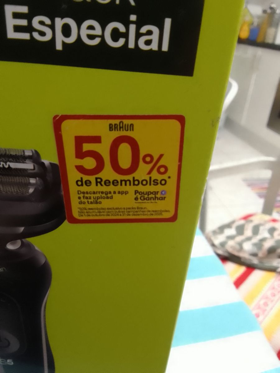 No dia 28 de dezembro o meu pai dirigiu-se à loja Worten de Chaves para adquirir uma cabeça para uma máquina de barbear Braun. Acabou por adquirir um pack especial da Braun constituído por máquina de Barbear e aparador de pelos: https://www.worten.pt/produtos/pack-especial-braun-series-5-maquina-de-barbear-recarregavel-3-cabecas-51w100-e-maquina-de-aparar-en10-8174616 com direito a reembolso de 50% do valor - promoção que decorre desde outubro de 2014 a dezembro de 2025, segundo o autocolante que está no pack.