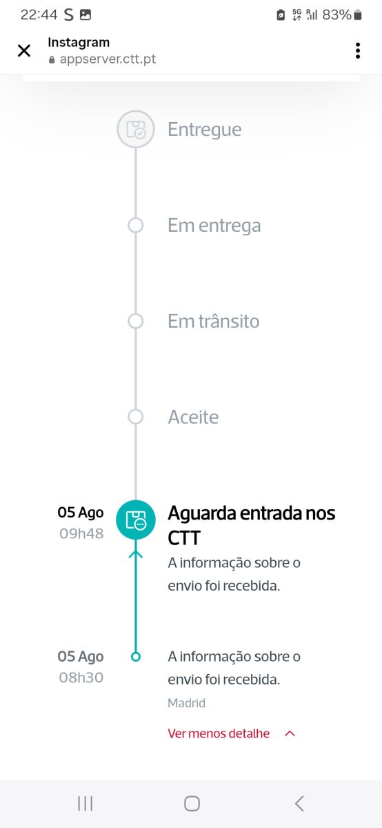 No dia 19 de Agosto enviei sms a questionar qual a previsao de entrega e responderam "quase a chegar" e juntaram o link de rastreio dos ctt em que menciona a minha cidade e que foi criado aquele ficheiro no dia 5 de agosto em madrid, e apresentava-se como: " AGUARDA ENTRADA NOS CTT". No dia 24 de agosto voltei a questionar porque nada alterou e responderam me que iam verificar o que se passou. Enviei novamente mensagem no dia 28 e hoje dia 1de Setembro e até ao momento nao recebi qualquer resposta.
